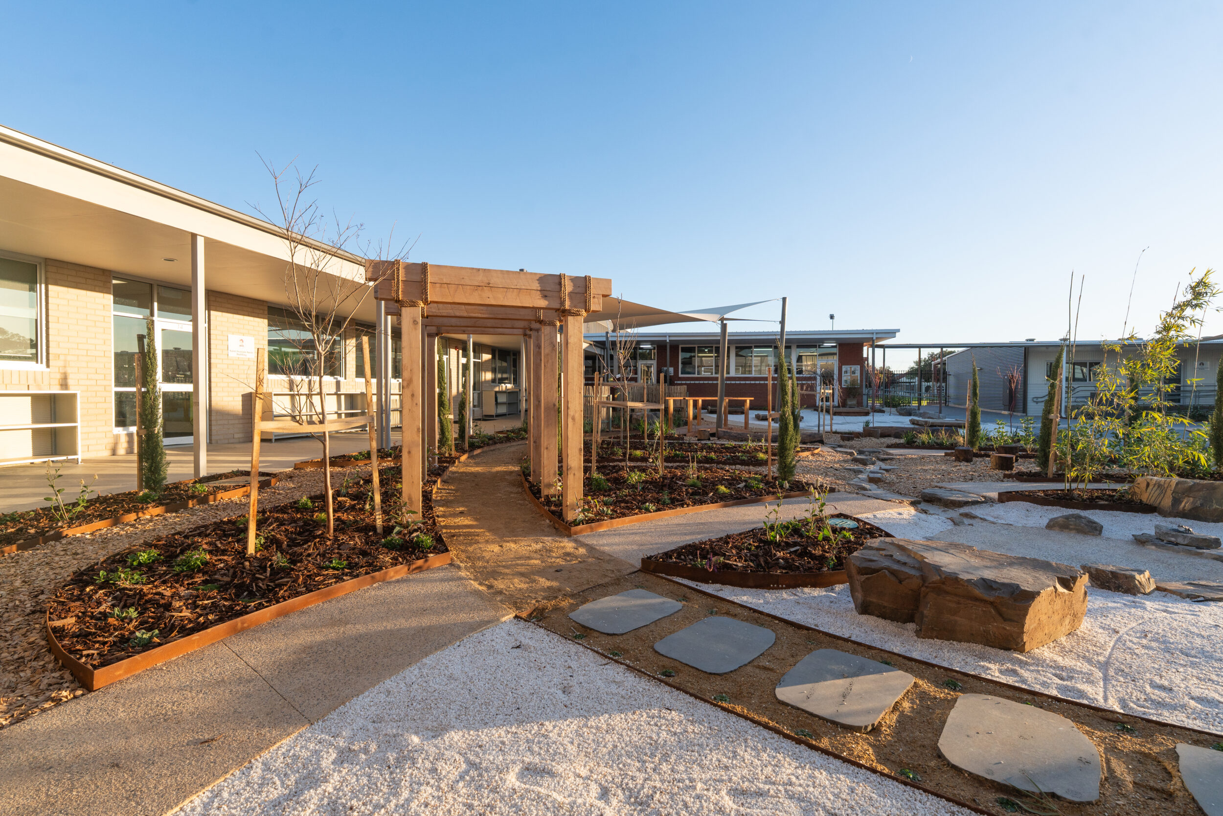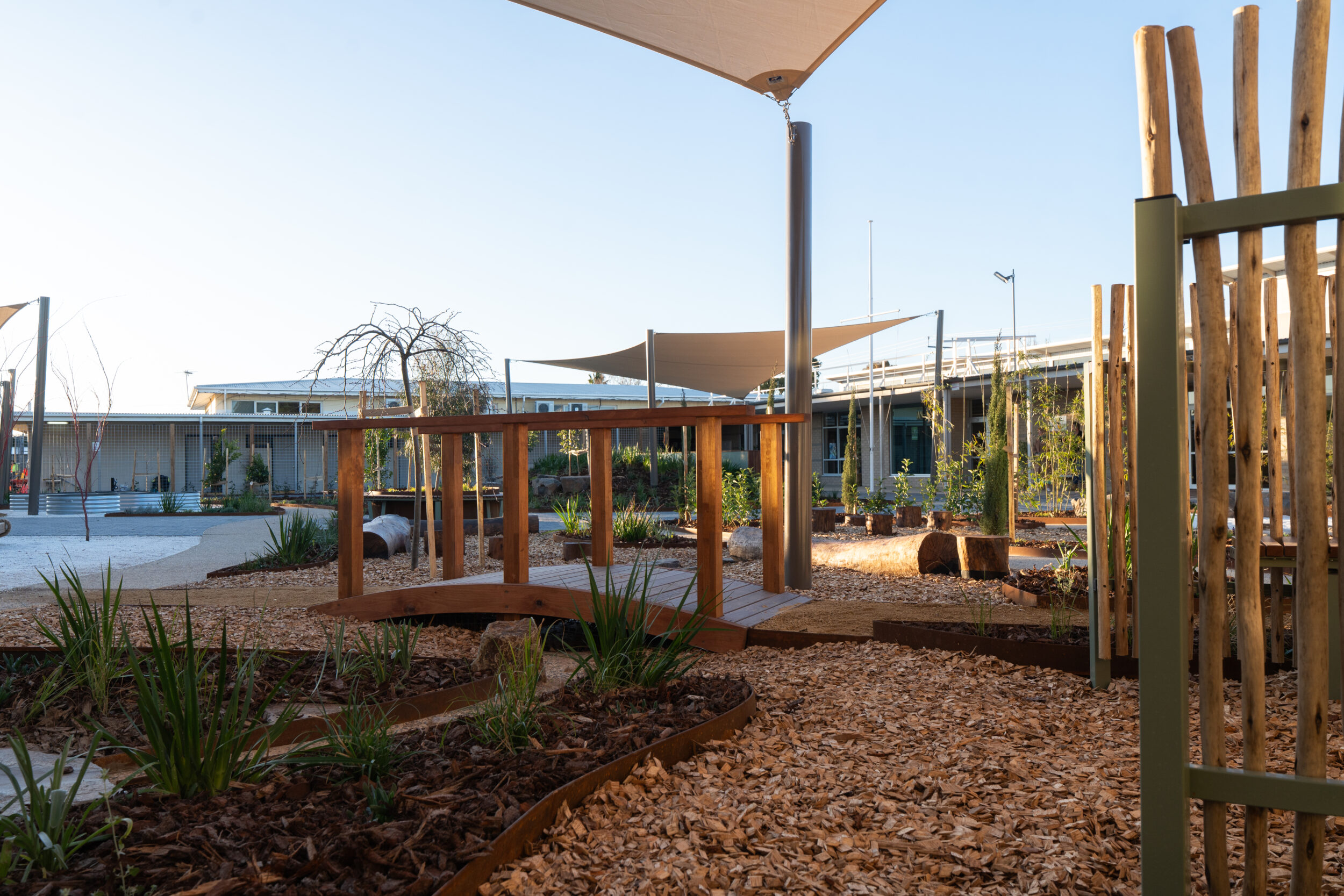 Sustainability was central to the project vision. Extensive planting replaces hard surfaces to promote passive cooling and shade, while reclaimed timber elements, a push-button water pump, and passive irrigation methods highlight environmental responsibility. Hardy native and exotic plantings were selected to reflect the seasons and support ecological learning.